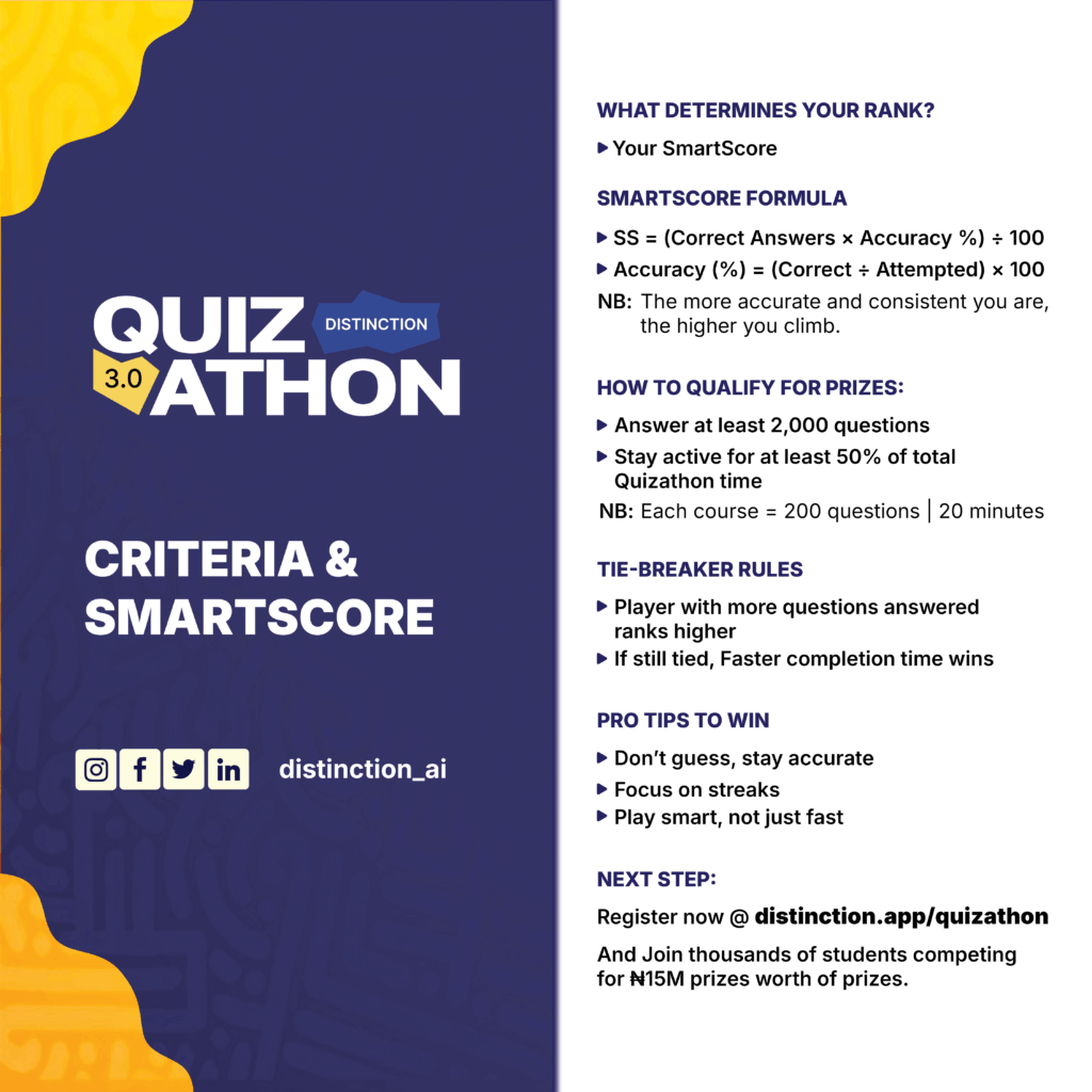 The moment we’ve all been waiting for is finally here. Quizathon 3.0 is just around the corner, and this time, it’s bigger than ever with ₦15 million in prizes up for grabs! Whether you’re a returning champion or a first-time participant, Quizathon 3.0 is your chance to prove your academic prowess and win big. So, how do you qualify for the prizes, and what determines your rank in this massive competition? Let’s break it down!
